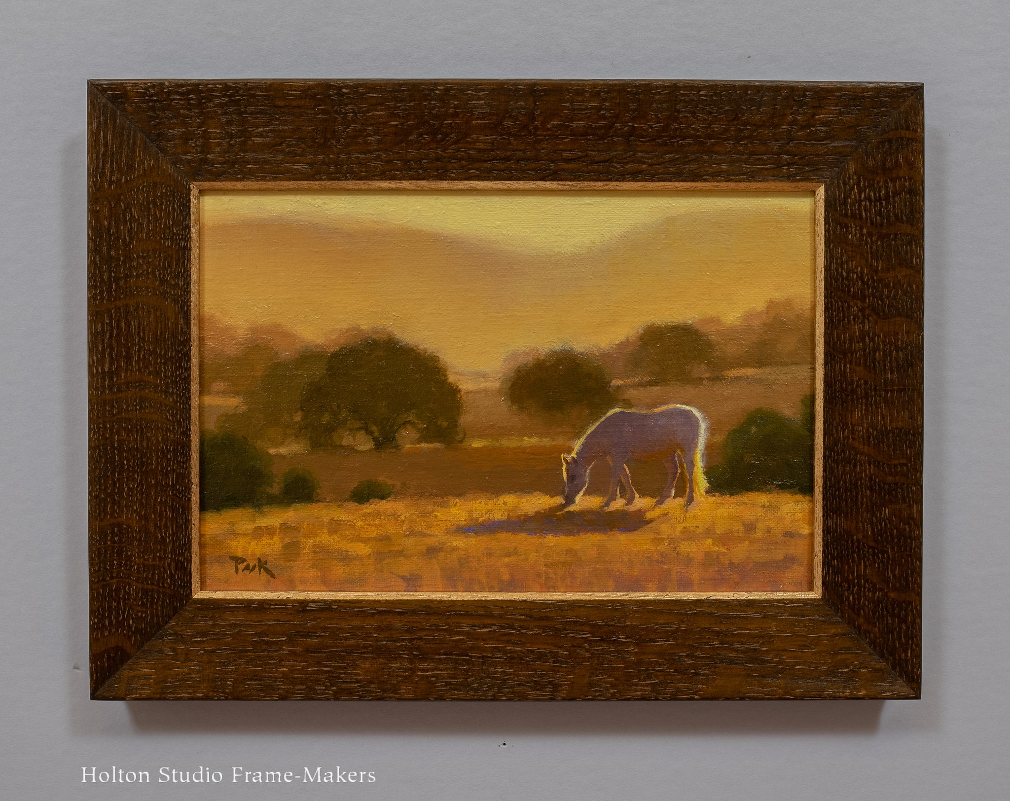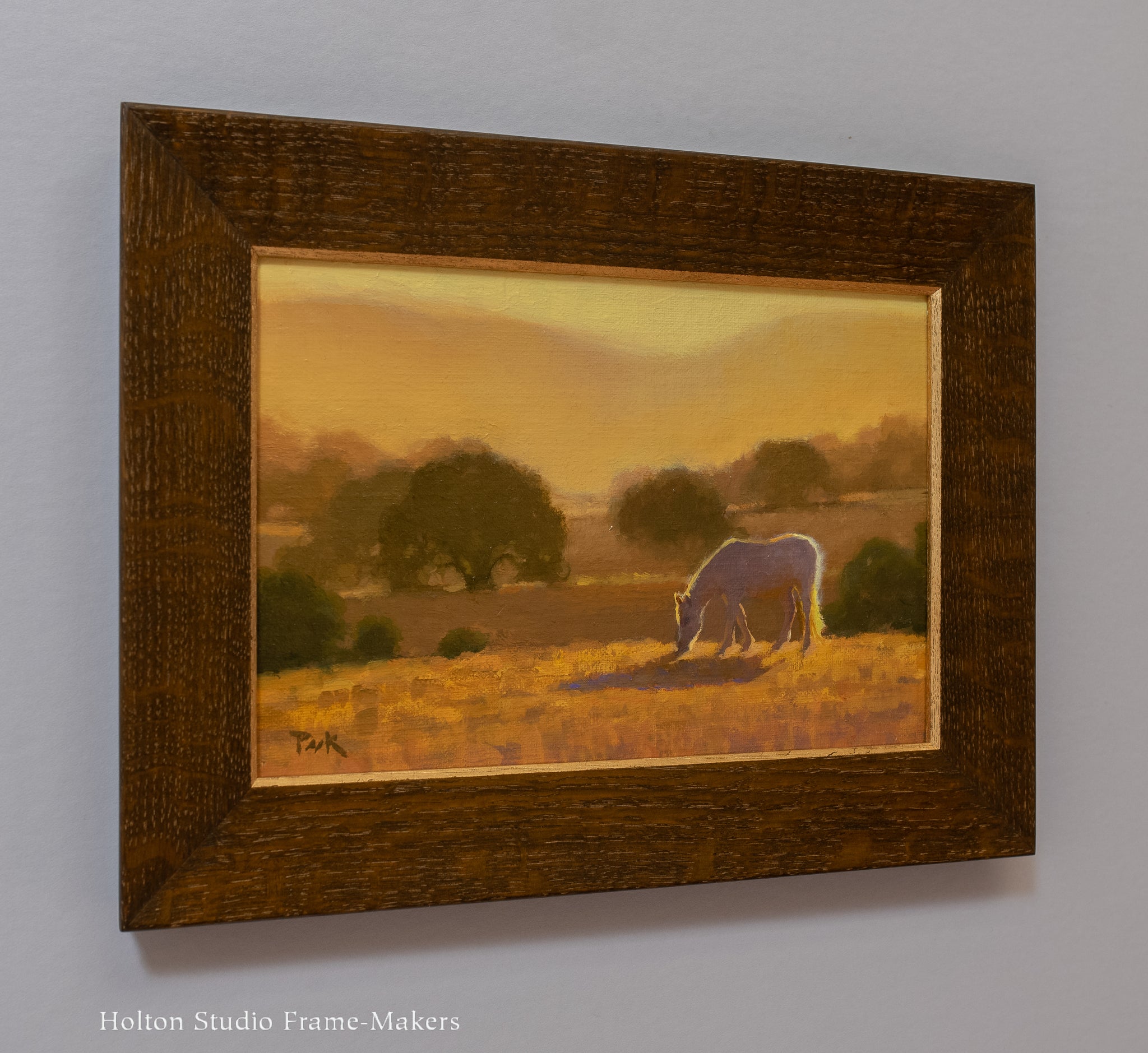 Framed in a No. 300.6—1 1/2" with rose gold sight edge. Quartersawn white oak with Medieval stain.