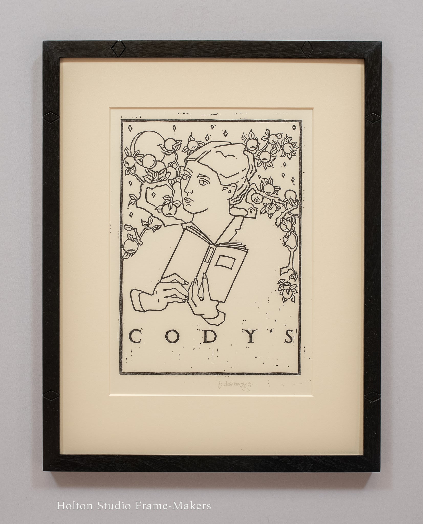 Framed in a No. 1—5/8" with special corner carving. Walnut with Black stain.