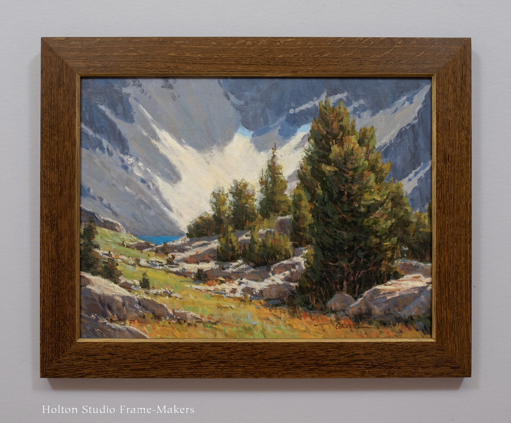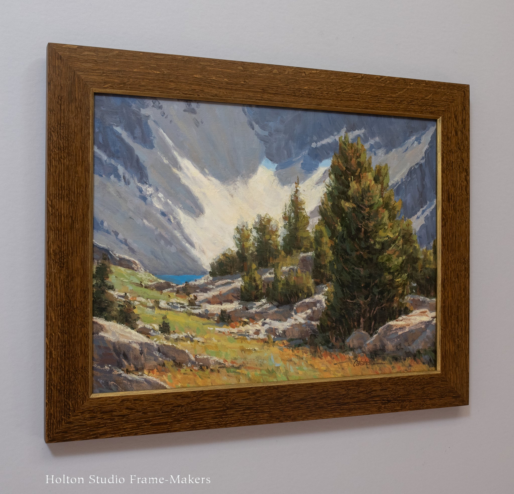 Framed in a No. 1.6—1 3/4" with bronze waxed sight edge. Fumed quartersawn white oak with clear linseed oil finish.